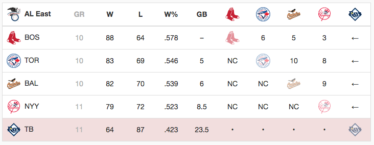 In this scenario, you can see the Boston Red Sox are leading their division, but can still be overtaken by the Toronto Blue Jays, Baltimore Orioles, and New York Yankees.